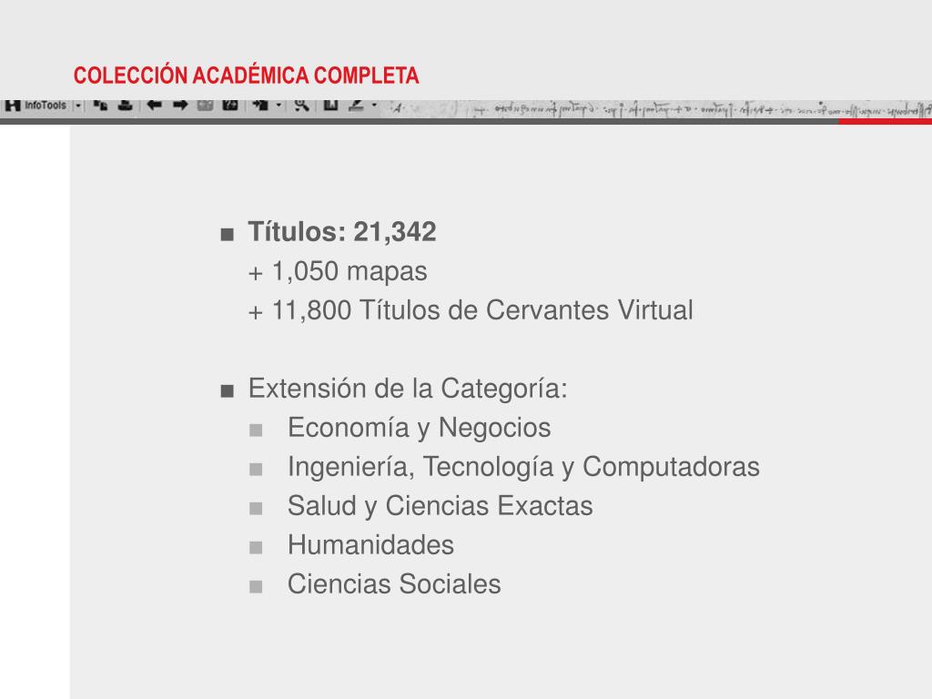 COLECCIÓN ACADÉMICA COMPLETA ■ Títulos: 21,342 + 1,050 mapas + 11,800 Títulos de Cervantes Virtual ■ Extensión de la Categoría: ■Economía y Negocios ■Ingeniería, Tecnología y Computadoras ■Salud y Ciencias Exactas ■Humanidades ■Ciencias Sociales