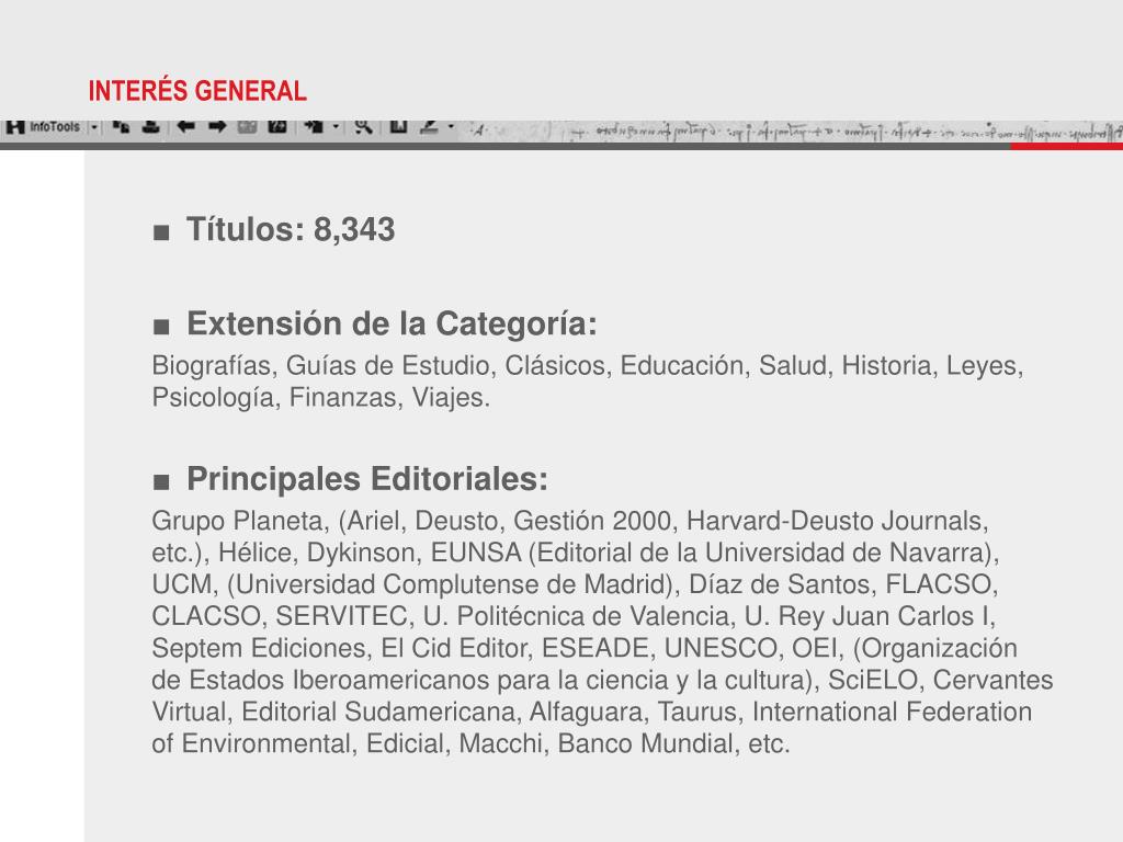 INTERÉS GENERAL ■ Títulos:8,343 ■ Extensión de la Categoría: Biografías, Guías de Estudio, Clásicos, Educación, Salud, Historia, Leyes, Psicología, Finanzas, Viajes. ■ Principales Editoriales: Grupo Planeta, (Ariel, Deusto, Gestión 2000, Harvard-Deusto Journals, etc.), Hélice, Dykinson, EUNSA (Editorial de la Universidad de Navarra), UCM, (Universidad Complutense de Madrid), Díaz de Santos, FLACSO, CLACSO, SERVITEC, U. Politécnica de Valencia, U. Rey Juan Carlos I, Septem Ediciones, El Cid Editor, ESEADE, UNESCO, OEI, (Organización de Estados Iberoamericanos para la ciencia y la cultura), SciELO, Cervantes Virtual, Editorial Sudamericana, Alfaguara, Taurus, International Federation of Environmental, Edicial, Macchi, Banco Mundial, etc.