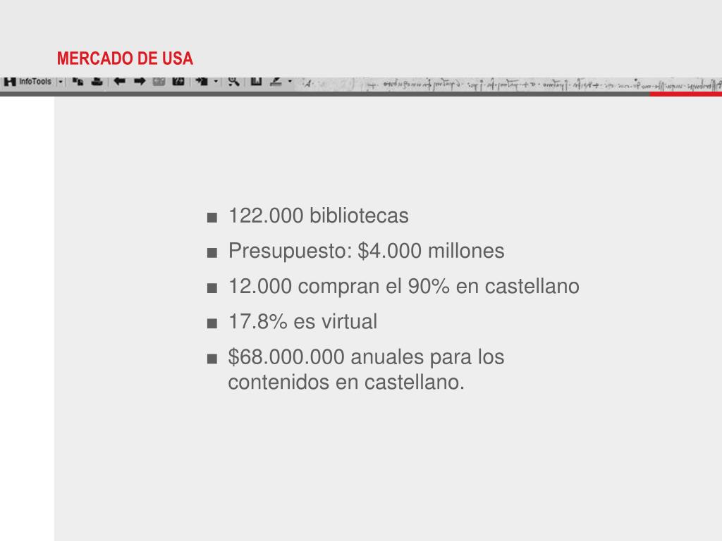 MERCADO DE USA ■ 122.000 bibliotecas ■ Presupuesto: $4.000 millones ■ 12.000 compran el 90% en castellano ■ 17.8% es virtual ■ $68.000.000 anuales para los contenidos en castellano.