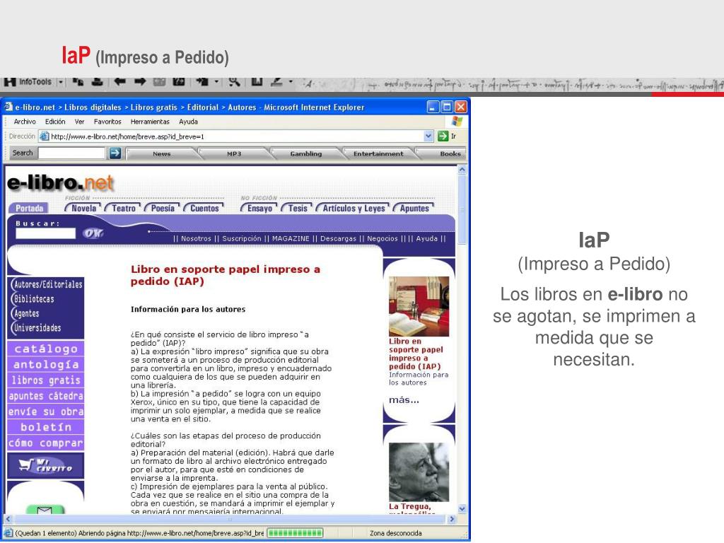 IaP(Impreso a Pedido) IaP (Impreso a Pedido) Los libros en e-libro no se agotan, se imprimen a medida que se necesitan.