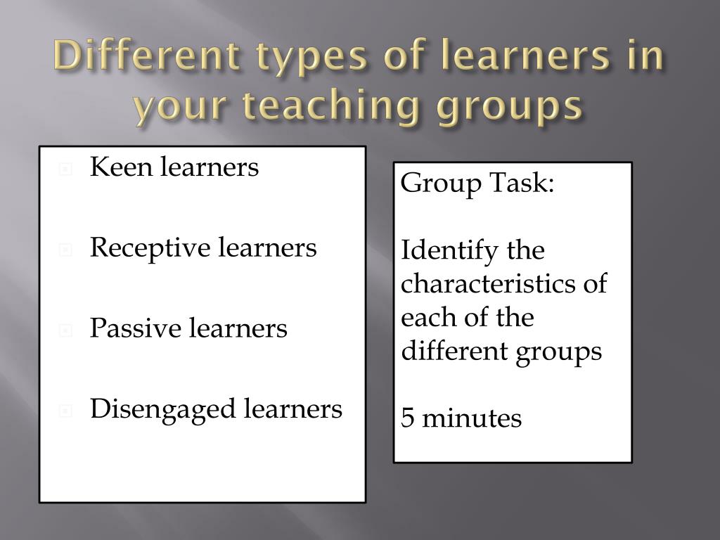 Different types of learners in your teaching groups • Keen learners • Receptive learners • Passive learners • Disengaged learners Group Task: Identify the characteristics of each of the different groups 5 minutes
