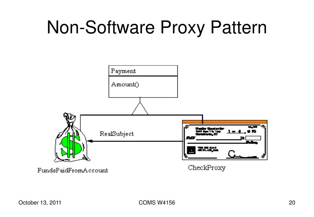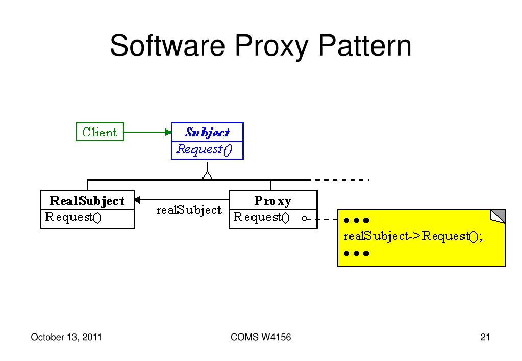 Example: Proxy Pattern • An object functions as an interface to another object • Provide a surrogate or placeholder that uses an extra level of indirection to support distributed, controlled or intelligent access to an object • In its most general form, a proxy is <something> functioning as an interface to <something else>. The <something else> could be anything: a network connection, a large object in memory, a file, or some other resource COMS W4156