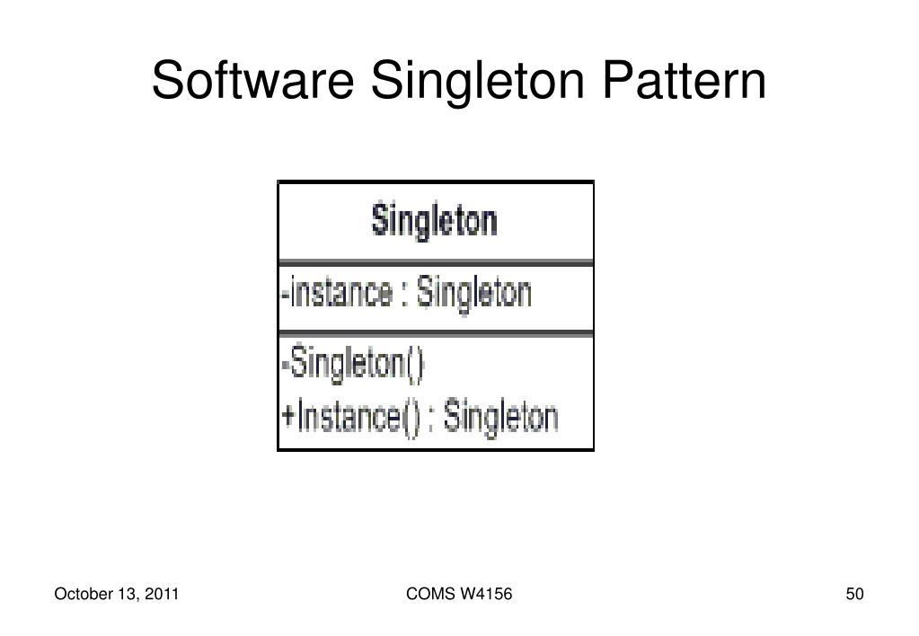 Singleton Pattern • Allow for only one instance of a given class to ever exist (encapsulates that the number of instances is constrained) • Provides a mechanism to obtain this instance that any client can access • Examples include objects needed for logging, communication, database access, etc. COMS W4156