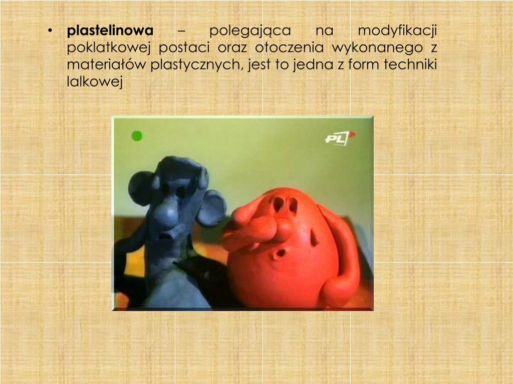 plastelinowa – polegająca na modyfikacji poklatkowej postaci oraz otoczenia wykonanego z materiałów plastycznych, jest to jedna z form techniki lalkowej