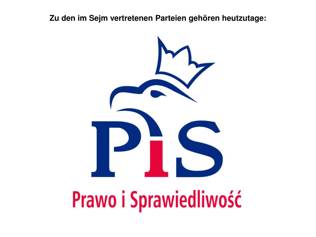 Die Republik Polen ist eine parlamentarische Demokratie.Die Grundsätze werden inder Verfassung vom 2. April 1997 bestimmt. Die politische Szene war in den 90-er Jahren sehr wechselvoll. Die Mehrheit der damaligen Parteien wurde ausgelöst oder in andere Fraktionen eingeteilt. Die meisten Parteien sind katholisch-konservativ, liberal-konservativ oder sozialdemokratisch.