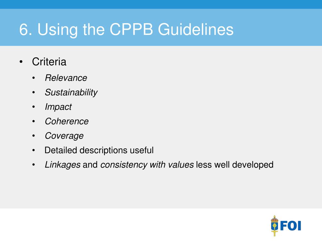 6. Using the CPPB Guidelines Criteria Relevance Sustainability Impact Coherence Coverage Detailed descriptions useful Linkages and consistency with values less well developed
