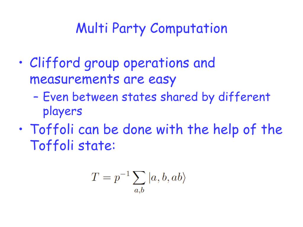 Multi Party Computation • Clifford group operations and measurements are easy • Even between states shared by different players • Toffoli can be done with the help of the Toffoli state: