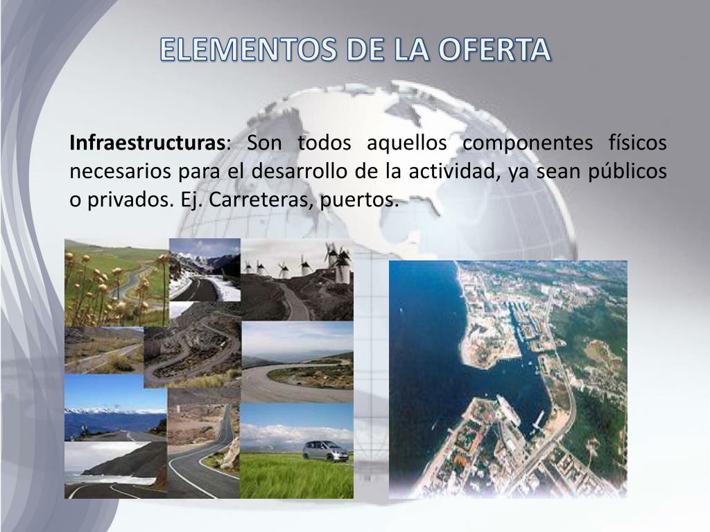 ELEMENTOS DE LA OFERTA Infraestructuras: Son todos aquellos componentes físicos necesarios para el desarrollo de la actividad, ya sean públicos o privados. Ej. Carreteras, puertos.