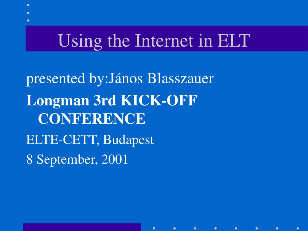 Using the Internet in ELT. presented by:János Blasszauer Longman 3rd KICK-OFF CONFERENCE ELTE-CETT, Budapest 8 September, 2001. Using the Internet in ELT. „Information is a wonderful thing, but it is not knowledge.