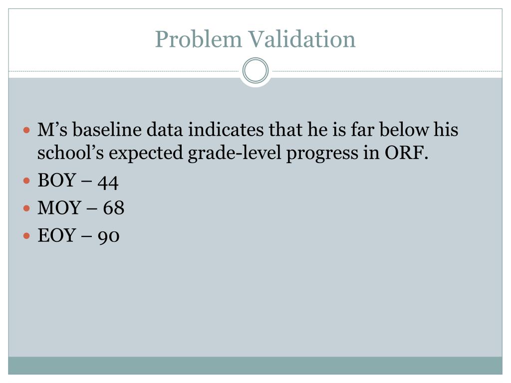 Problem Validation M’s baseline data indicates that he is far below his school’s expected grade-level progress in ORF. BOY – 44 MOY – 68 EOY – 90
