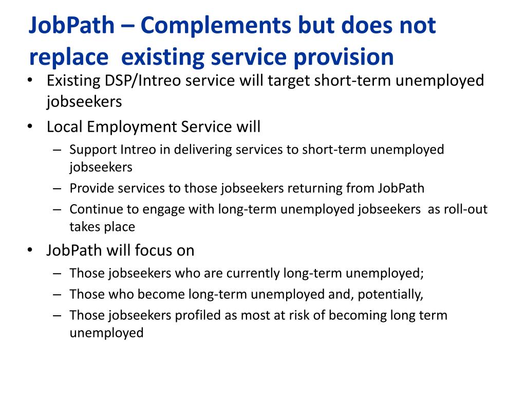 JobPath – Complements but does not replace existing service provision • Existing DSP/Intreo service will target short-term unemployed jobseekers • Local Employment Service will • Support Intreo in delivering services to short-term unemployed jobseekers • Provide services to those jobseekers returning from JobPath • Continue to engage with long-term unemployed jobseekers as roll-out takes place • JobPath will focus on • Those jobseekers who are currently long-term unemployed; • Those who become long-term unemployed and, potentially, • Those jobseekers profiled as most at risk of becoming long term unemployed