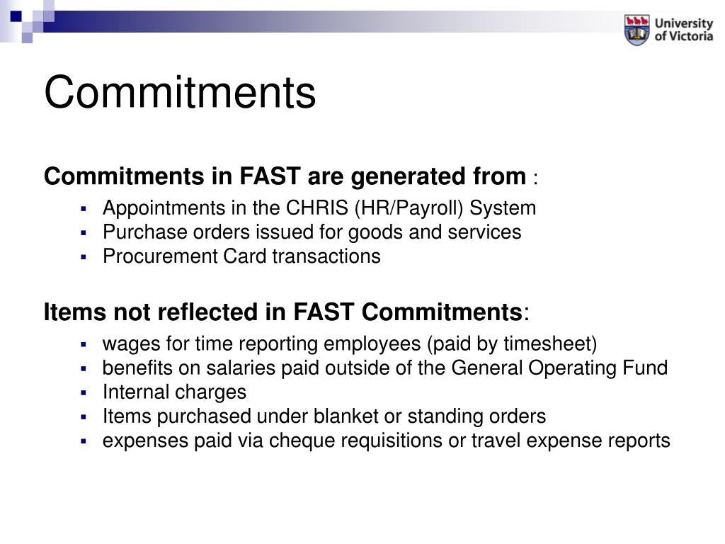 Commitments Commitments in FAST are generated from : • Appointments in the CHRIS (HR/Payroll) System • Purchase orders issued for goods and services • Procurement Card transactions Items not reflected in FAST Commitments: • wages for time reporting employees (paid by timesheet) • benefits on salaries paid outside of the General Operating Fund • Internal charges • Items purchased under blanket or standing orders • expenses paid via cheque requisitions or travel expense reports