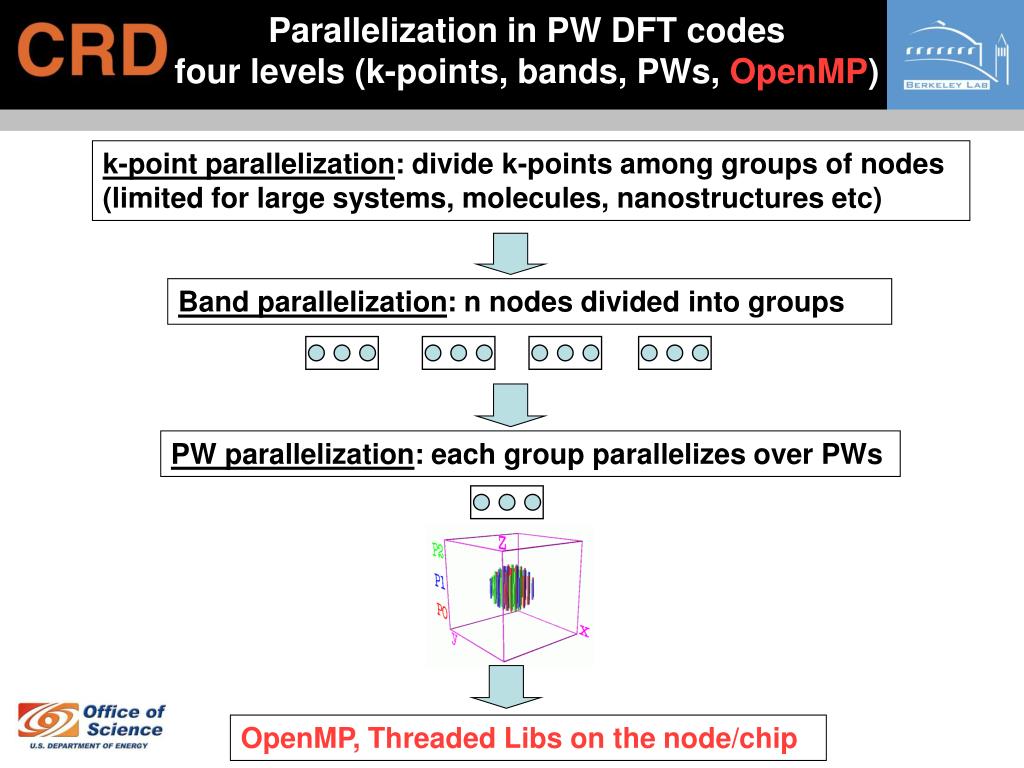 Parallelization in PW DFT codes four levels (k-points, bands, PWs, OpenMP) k-point parallelization: divide k-points among groups of nodes (limited for large systems, molecules, nanostructures etc) Band parallelization: n nodes divided into groups PW parallelization: each group parallelizes over PWs OpenMP, Threaded Libs on the node/chip