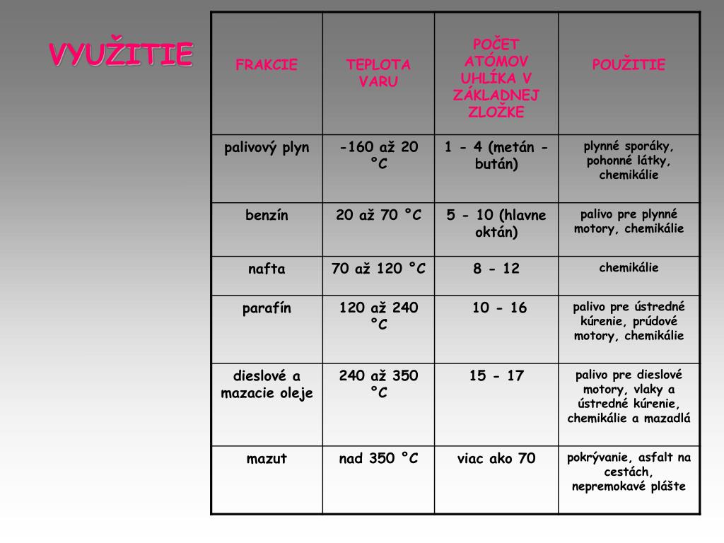 Základomspracovania ropy je jej frakčná destilácia, • priktorejsaoddeľujú • priatmosférickom tlaku jednotlivé skupiny uhľovodíkovpodľaich bodu varu.