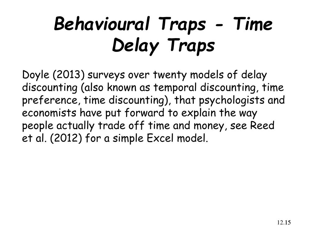 Behavioural Traps - Time Delay Traps People are constantly making decisions that involve whether they take gains (also losses) now or at some later time(s). Individuals ‘discount the future’ when they value imminent goods over future goods. Discounting is typically assessed by offering real or hypothetical choices between different monetary sums after different delays. 12.17 17