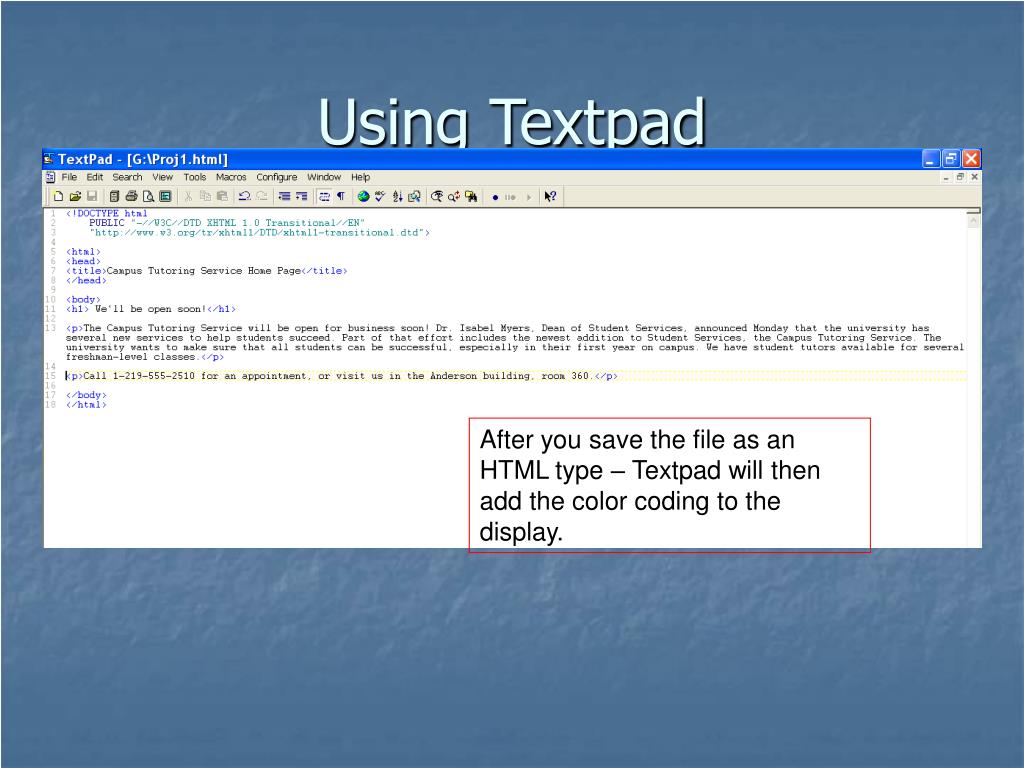 Using Textpad After you save the file as an HTML type – Textpad will then add the color coding to the display.