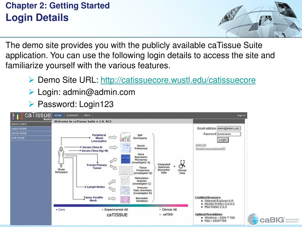 Chapter 2: Getting Started In this topic, you will be introduced to: • The terminologies used in caTissue Suite • The simple caTissue Suite workflow • The overview of the application • The various role-based users and the tasks performed by them • The functional block diagram that outlines the tasks performed by various role-based users • The publicly available demo site • The login details to access the caTissue Suite application • The user interface organization of the application