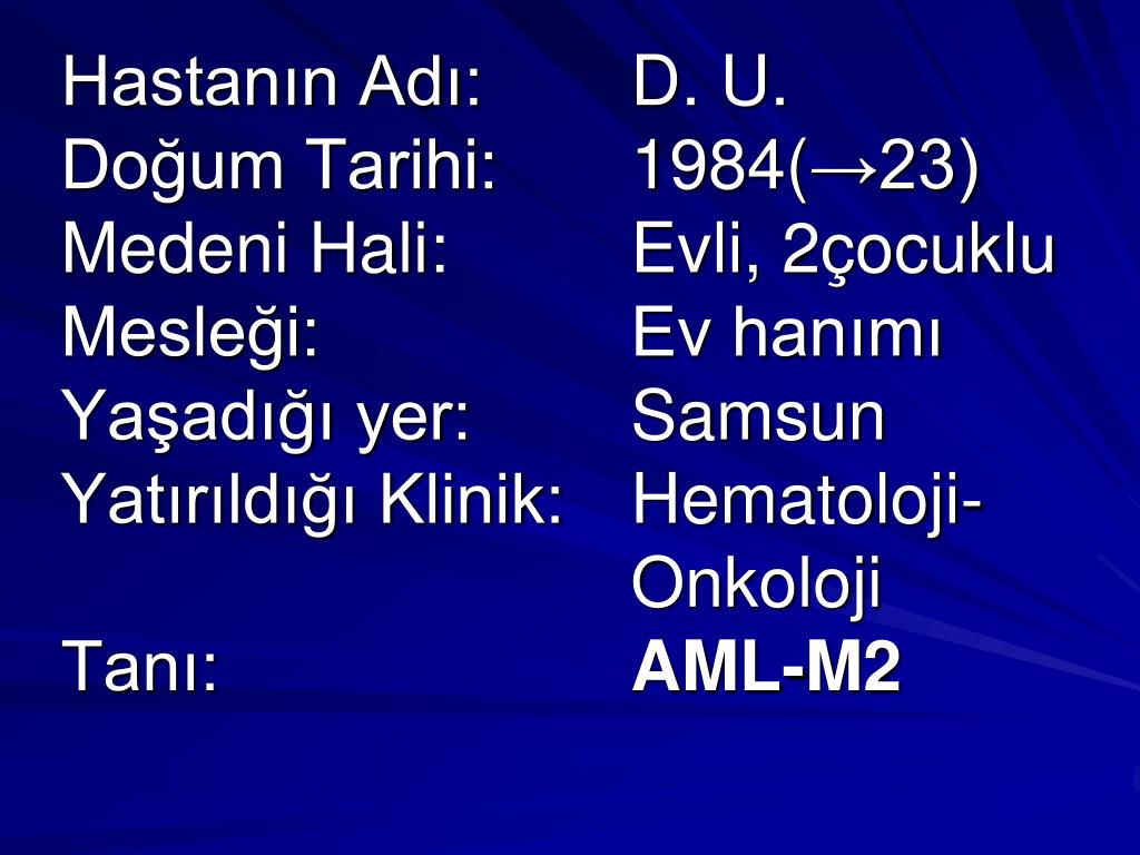 Hastanın Adı: D. U.Doğum Tarihi: 1984(→23)Medeni Hali: Evli, 2çocukluMesleği: Ev hanımıYaşadığı yer: SamsunYatırıldığı Klinik: Hematoloji- OnkolojiTanı: AML-M2