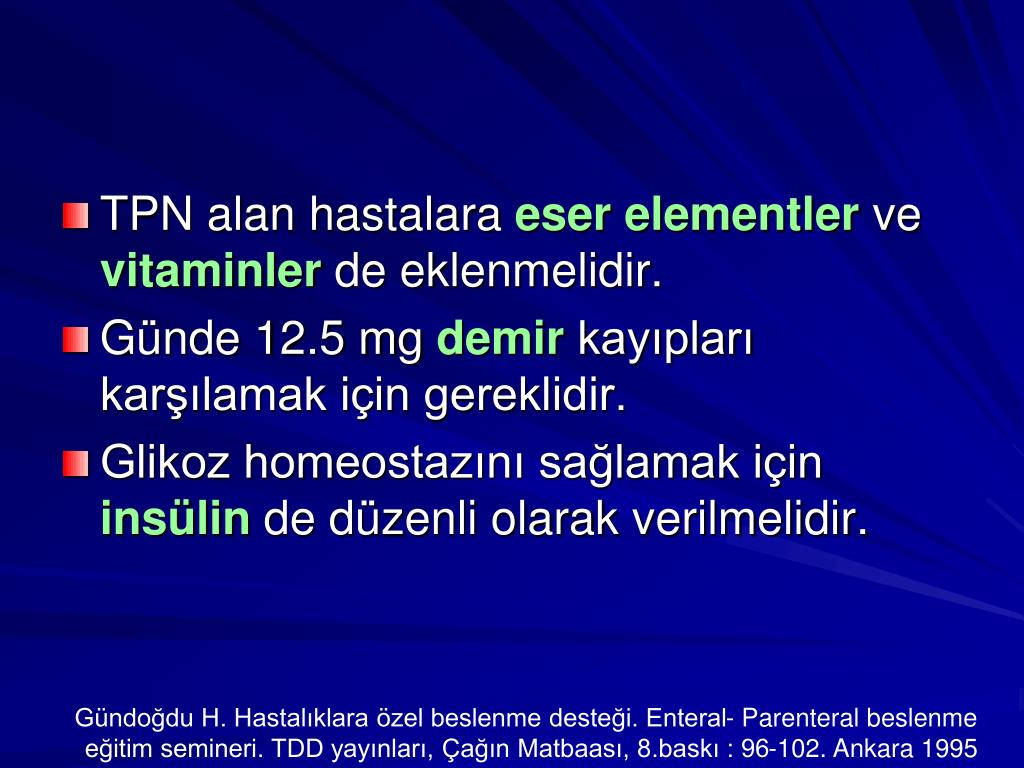 TPN alan hastalara eser elementler ve vitaminler de eklenmelidir. • Günde 12.5 mgdemirkayıpları karşılamak için gereklidir. • Glikoz homeostazını sağlamak için insülin de düzenli olarak verilmelidir. Gündoğdu H. Hastalıklara özel beslenme desteği. Enteral- Parenteral beslenme eğitim semineri. TDD yayınları, Çağın Matbaası, 8.baskı : 96-102. Ankara 1995