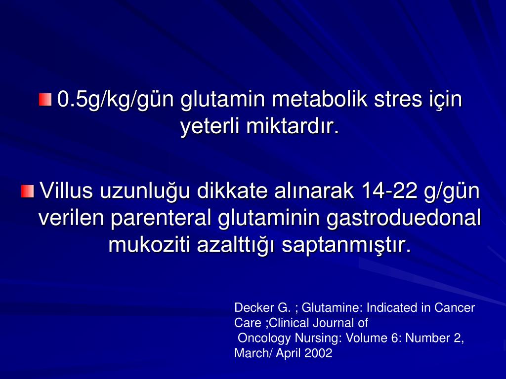 0.5g/kg/gün glutamin metabolik stres için yeterli miktardır. • Villus uzunluğu dikkate alınarak 14-22 g/gün verilen parenteral glutaminin gastroduedonal mukoziti azalttığı saptanmıştır. Decker G. ; Glutamine: Indicated in Cancer Care ;Clinical Journal of Oncology Nursing: Volume 6: Number 2, March/ April 2002