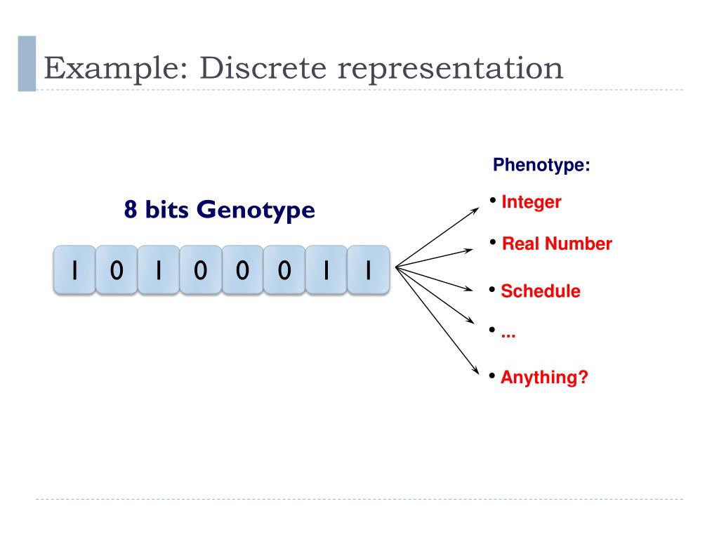 Example: Discrete representation Phenotype could be integer numbers Genotype: Phenotype: = 163 1 0 1 0 0 0 1 1 1*27 + 0*26 + 1*25 + 0*24 + 0*23 + 0*22 + 1*21 + 1*20= 128 + 32 + 2 + 1 = 163