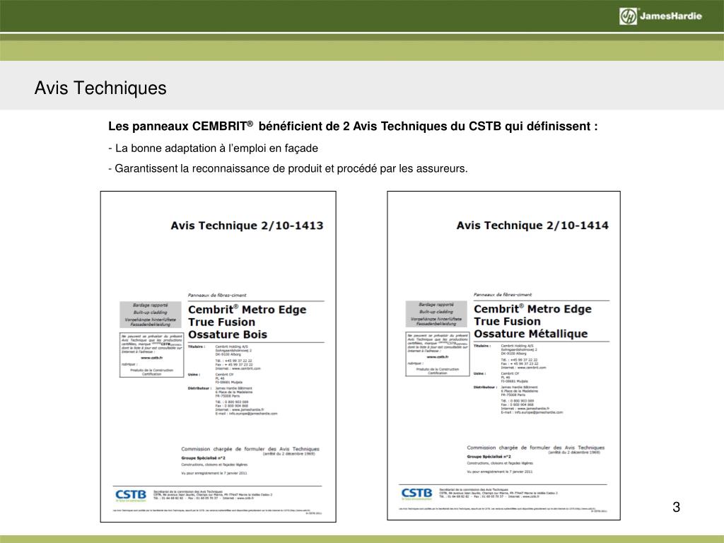 Avis Techniques Les panneaux CEMBRIT® bénéficient de 2 Avis Techniques du CSTB qui définissent : - La bonne adaptation à l’emploi en façade - Garantissent la reconnaissance de produit et procédé par les assureurs.