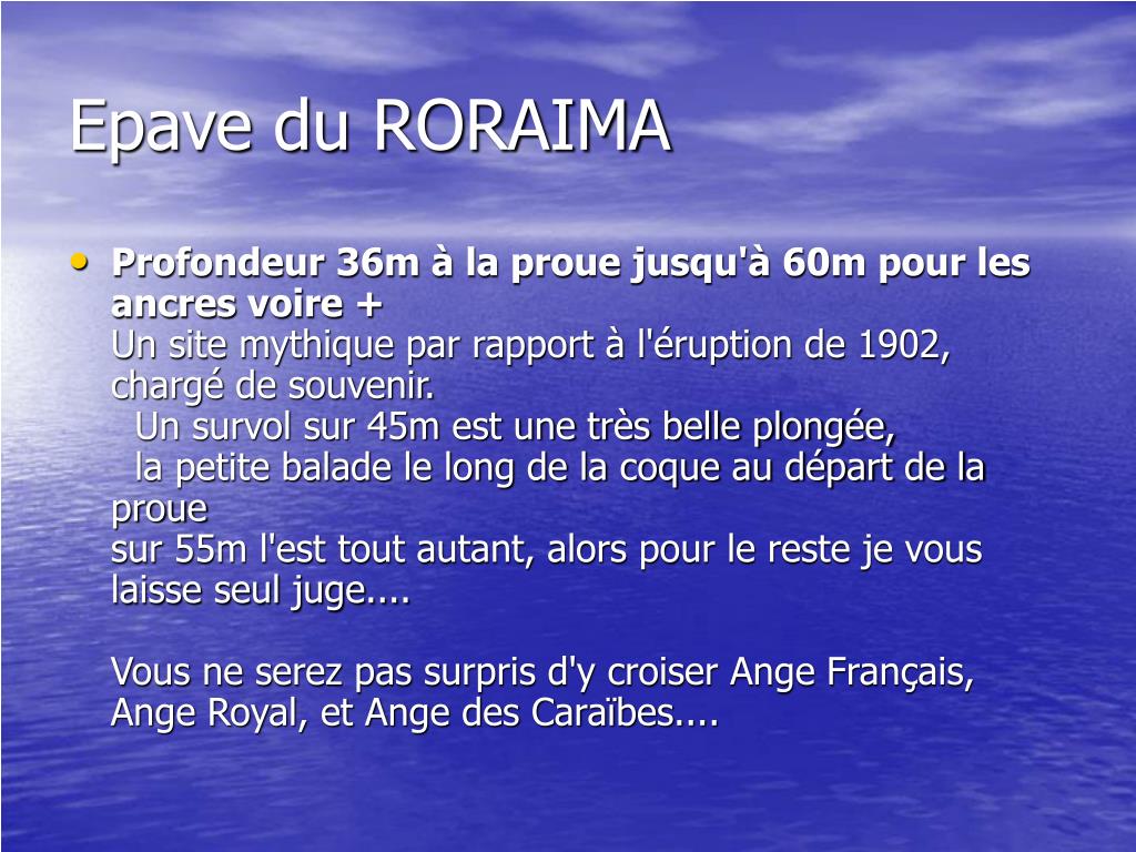 Epave du RORAIMA • Profondeur 36m à la proue jusqu'à 60m pour les ancres voire +Un site mythique par rapport à l'éruption de 1902, chargé de souvenir. Un survol sur 45m est une très belle plongée, la petite balade le long de la coque au départ de la proue sur 55m l'est tout autant, alors pour le reste je vous laisse seul juge.... Vous ne serez pas surpris d'y croiser Ange Français, Ange Royal, et Ange des Caraïbes....