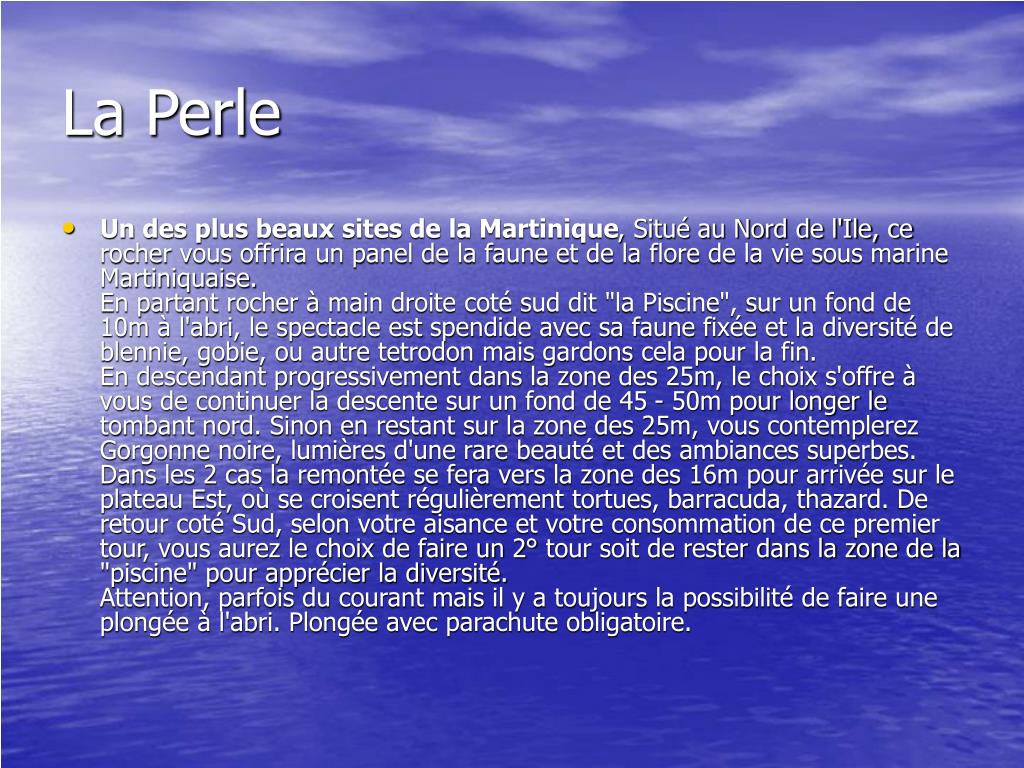 La Perle • Un des plus beaux sites de la Martinique, Situé au Nord de l'Ile, ce rocher vous offrira un panel de la faune et de la flore de la vie sous marine Martiniquaise. En partant rocher à main droite coté sud dit "la Piscine", sur un fond de 10m à l'abri, le spectacle est spendide avec sa faune fixée et la diversité de blennie, gobie, ou autre tetrodon mais gardons cela pour la fin. En descendant progressivement dans la zone des 25m, le choix s'offre à vous de continuer la descente sur un fond de 45 - 50m pour longer le tombant nord. Sinon en restant sur la zone des 25m, vous contemplerez Gorgonne noire, lumières d'une rare beauté et des ambiances superbes. Dans les 2 cas la remontée se fera vers la zone des 16m pour arrivée sur le plateau Est, où se croisent régulièrement tortues, barracuda, thazard. De retour coté Sud, selon votre aisance et votre consommation de ce premier tour, vous aurez le choix de faire un 2° tour soit de rester dans la zone de la "piscine" pour apprécier la diversité. Attention, parfois du courant mais il y a toujours la possibilité de faire une plongée à l'abri. Plongée avec parachute obligatoire.