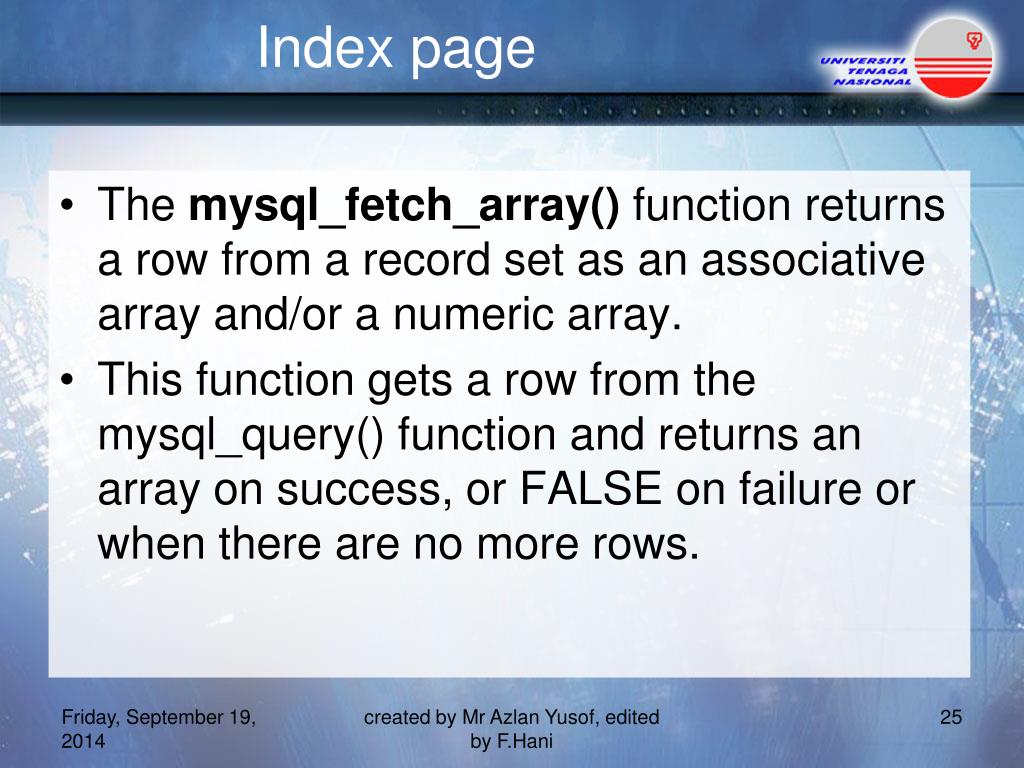 Index page • Syntax: mysql_fetch_array(data,array_type) created by Mr Azlan Yusof, edited by F.Hani
