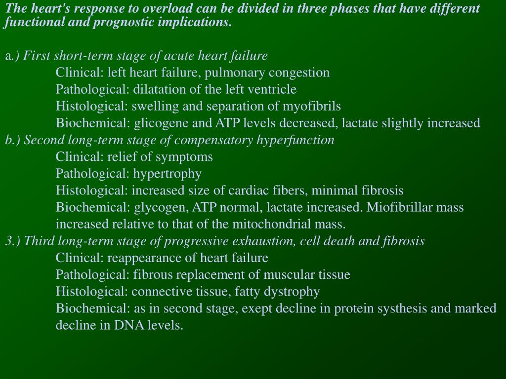 The heart's response to overload can be divided in three phases that have different functional and prognostic implications. a.) First short-term stage of acute heart failure Clinical: left heart failure, pulmonary congestion Pathological: dilatation of the left ventricle Histological: swelling and separation of myofibrils Biochemical: glicogene and ATP levels decreased, lactate slightly increased b.) Second long-term stage of compensatory hyperfunction Clinical: relief of symptoms Pathological: hypertrophy Histological: increased size of cardiac fibers, minimal fibrosis Biochemical: glycogen, ATP normal, lactate increased. Miofibrillar mass increased relative to that of the mitochondrial mass. 3.) Third long-term stage of progressive exhaustion, cell death and fibrosis Clinical: reappearance of heart failure Pathological: fibrous replacement of muscular tissue Histological: connective tissue, fatty dystrophy Biochemical: as in second stage, exept decline in protein systhesis and marked decline in DNA levels.