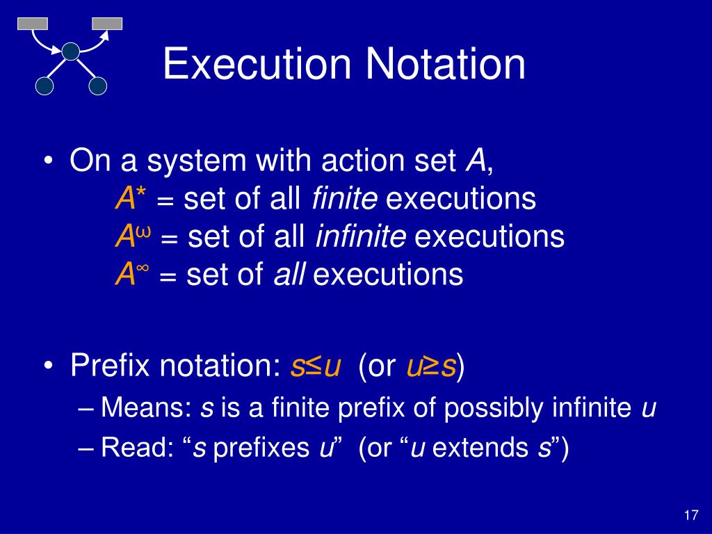 Execution Notation • On a system with action set A,A* = set of all finiteexecutionsAω= set of all infiniteexecutionsA∞ = set of allexecutions • Prefix notation: s≤u (or u≥s) • Means: s is a finite prefix of possibly infinite u • Read: “s prefixes u” (or “u extends s”)