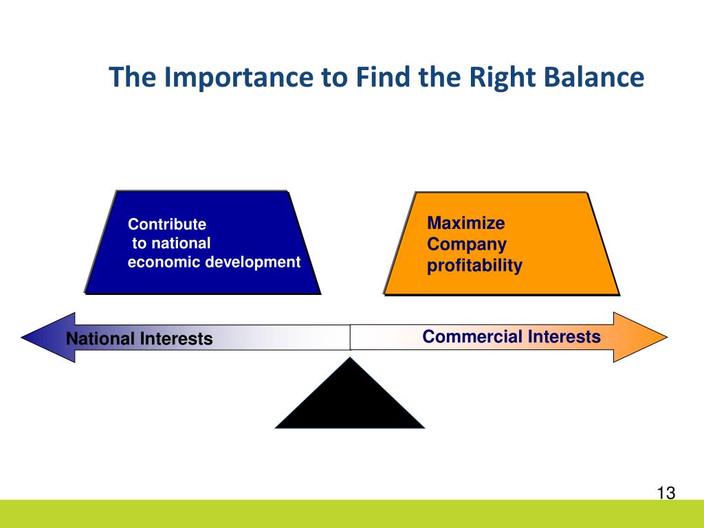 Commercial Interests National Interests The Importance to Find the Right Balance Contribute to national economic development Maximize Company profitability 13