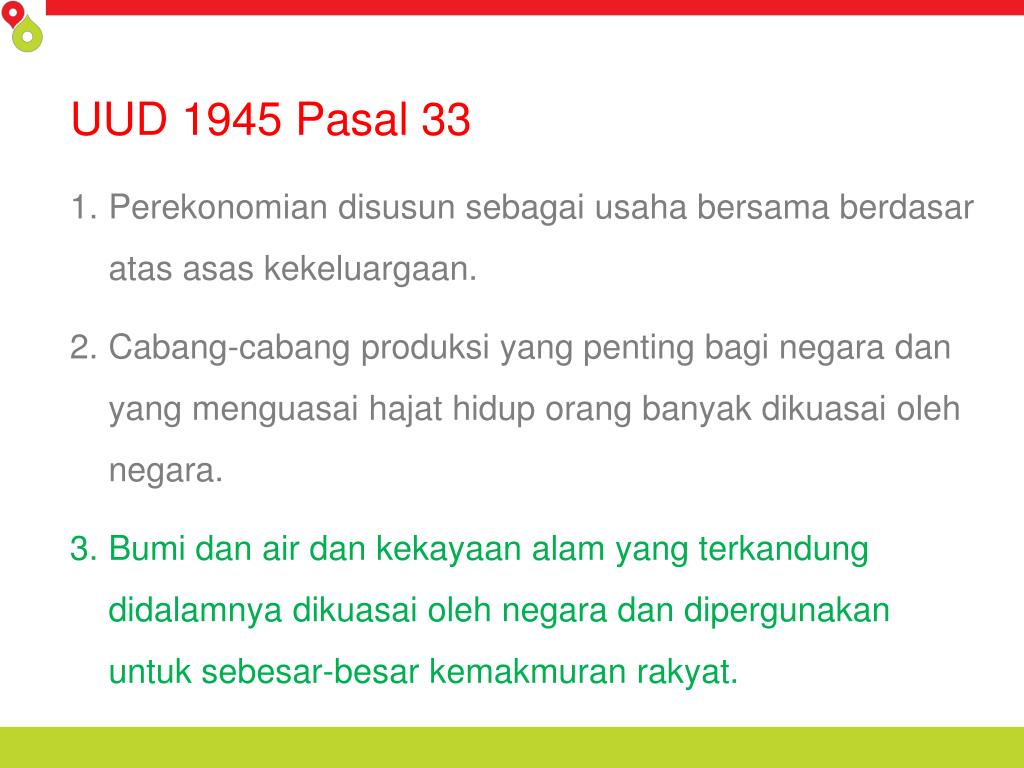 UUD 1945 Pasal 33 Perekonomian disusun sebagai usaha bersama berdasar atas asas kekeluargaan. Cabang-cabang produksi yang penting bagi negara dan yang menguasai hajat hidup orang banyak dikuasai oleh negara. Bumi dan air dan kekayaan alam yang terkandung didalamnya dikuasai oleh negara dan dipergunakan untuk sebesar-besar kemakmuran rakyat.