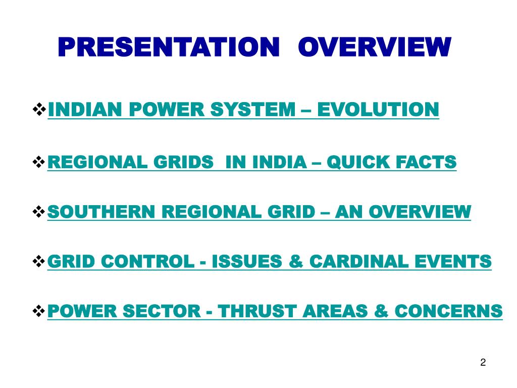 PRESENTATION OVERVIEW • INDIAN POWER SYSTEM – EVOLUTION • REGIONAL GRIDS IN INDIA – QUICK FACTS • SOUTHERN REGIONAL GRID – AN OVERVIEW • GRID CONTROL - ISSUES & CARDINAL EVENTS • POWER SECTOR - THRUST AREAS & CONCERNS
