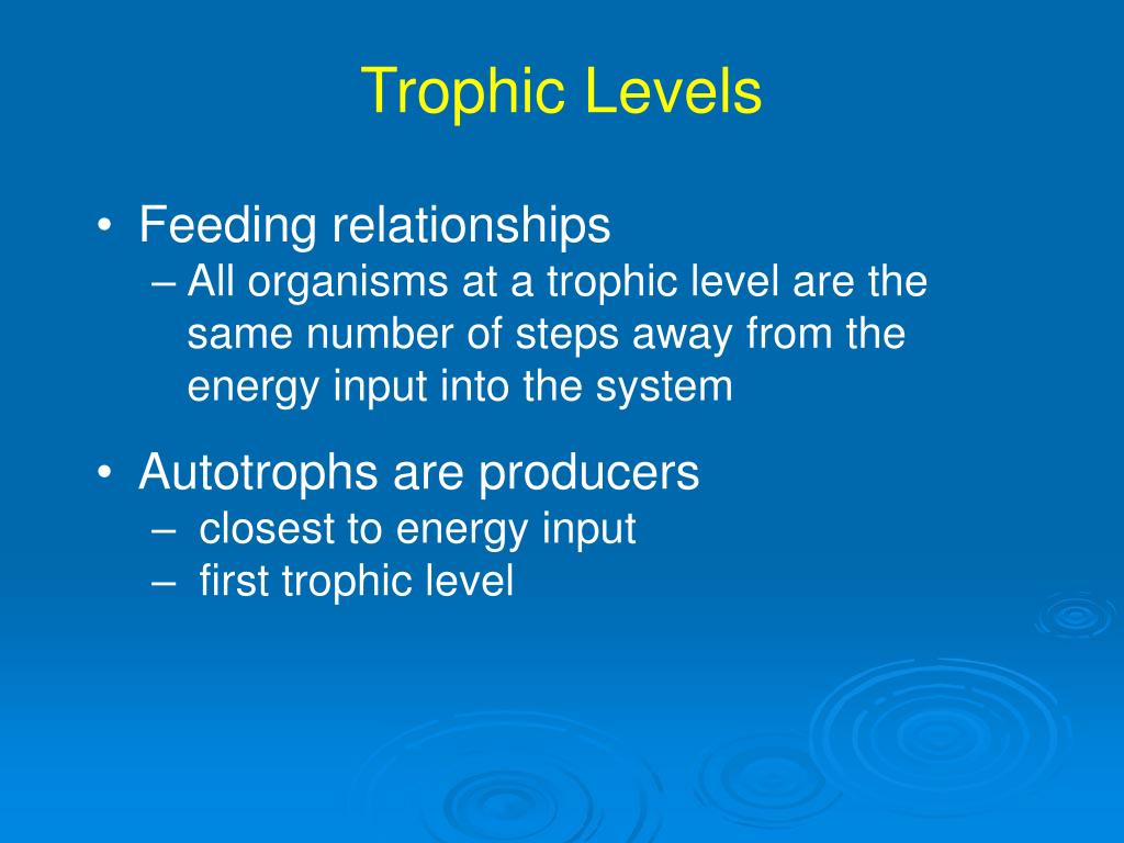 Trophic Levels • Feeding relationships • All organisms at a trophic level are the same number of steps away from the energy input into the system • Autotrophs are producers • closest to energy input • first trophic level