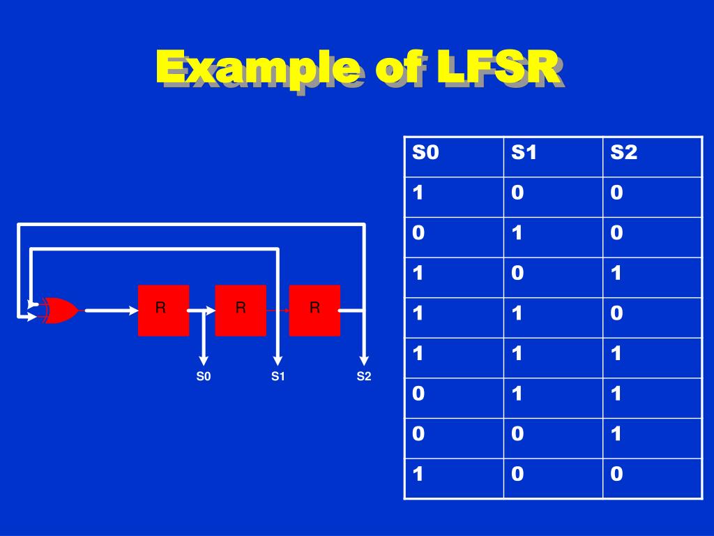 Example External XOR LFSR with Reset • Characteristic polynomial f (x) = 1 + x + x3 (read taps from right to left)