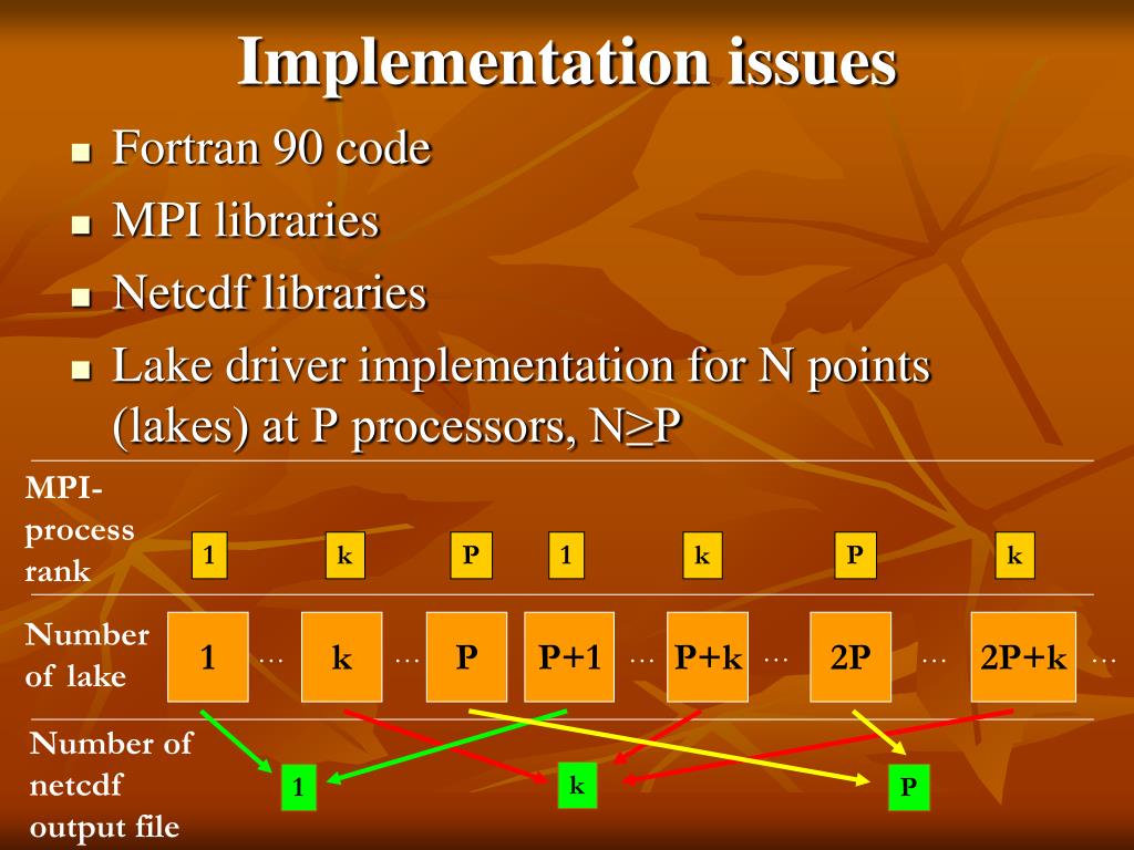Implementation issues • Fortran 90 code • MPI libraries • Netcdf libraries • Lake driver implementation for N points (lakes) at P processors, N≥P MPI- process rank 1 k P 1 k P k Number of lake 1 k P P+1 P+k 2P 2P+k … … … … … … Number of netcdf output file k 1 P