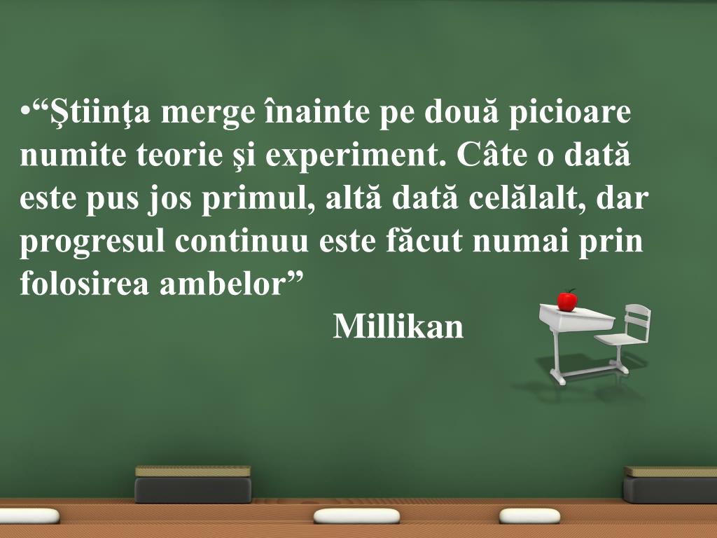 “Ştiinţa merge înainte pe două picioare numite teorie şi experiment. Câte o dată este pus jos primul, altă dată celălalt, dar progresul continuu este făcut numai prin folosirea ambelor” Millikan