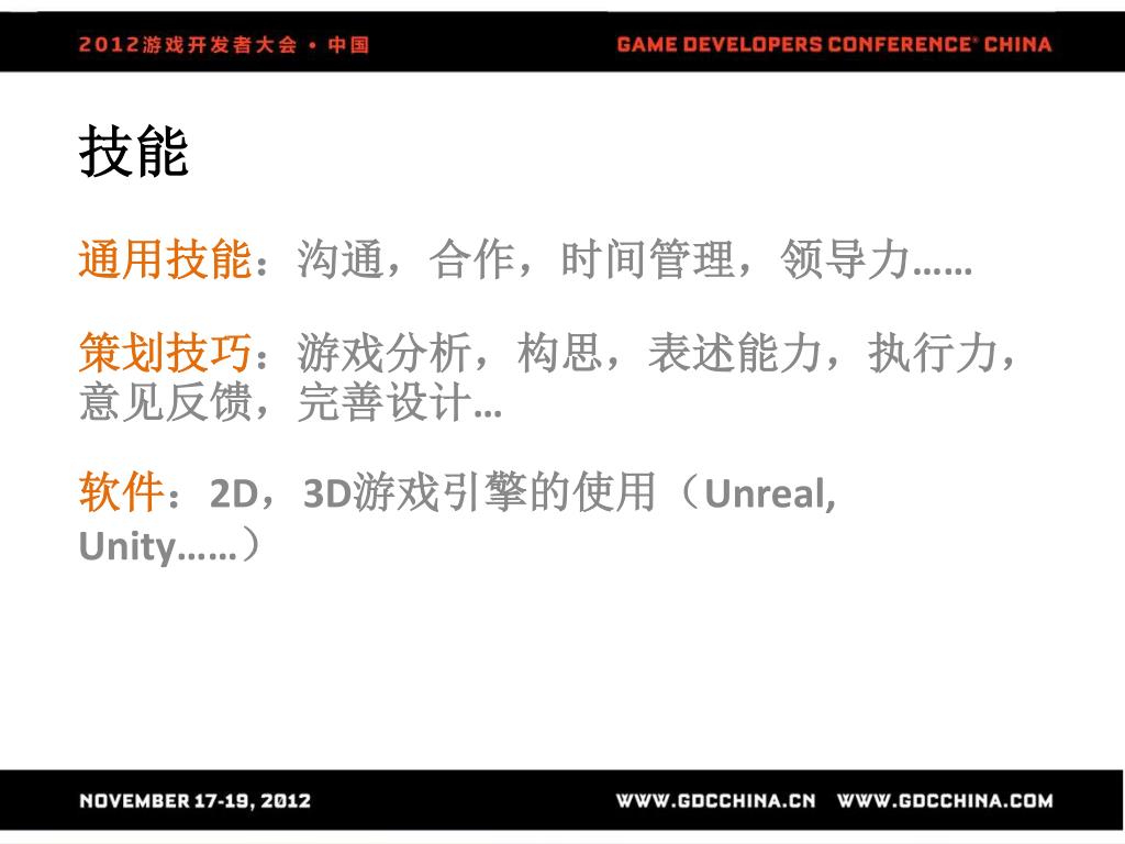 技能 • 通用技能:沟通,合作,时间管理,领导力…… • 策划技巧:游戏分析,构思,表述能力,执行力,意见反馈,完善设计… • 软件:2D,3D游戏引擎的使用(Unreal, Unity……)