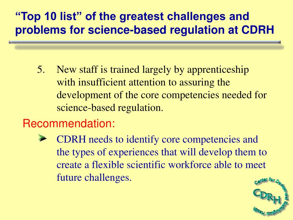 “Top 10 list” of the greatest challenges and problems for science-based regulation at CDRH • New staff is trained largely by apprenticeship with insufficient attention to assuring the development of the core competencies needed for science-based regulation. Recommendation: • CDRH needs to identify core competencies and the types of experiences that will develop them to create a flexible scientific workforce able to meet future challenges.