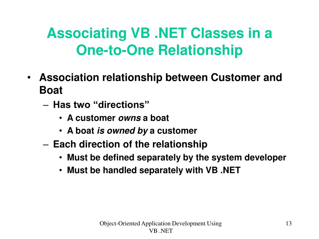 Associating VB .NET Classes in a One-to-One Relationship • Association relationship between Customer and Boat • Has two “directions” • A customer owns a boat • A boat is owned by a customer • Each direction of the relationship • Must be defined separately by the system developer • Must be handled separately with VB .NET Object-Oriented Application Development Using VB .NET