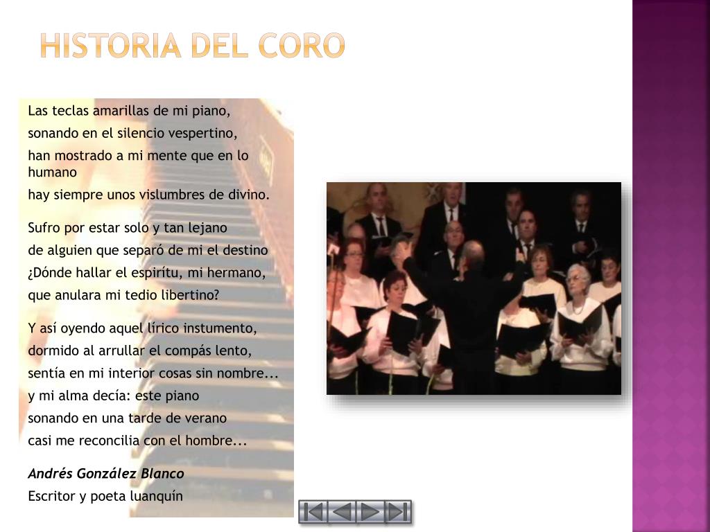 Historia del Coro Las teclas amarillas de mi piano, sonando en el silencio vespertino, han mostrado a mi mente que en lo humano hay siempre unos vislumbres de divino.Sufro por estar solo y tan lejano de alguien que separó de mi el destino ¿Dónde hallar el espirítu, mi hermano, que anulara mi tedio libertino?Y así oyendo aquel lírico instumento, dormido al arrullar el compás lento, sentía en mi interior cosas sin nombre... y mi alma decía: este piano sonando en una tarde de verano casi me reconcilia con el hombre...Andrés González Blanco Escritor y poeta luanquín