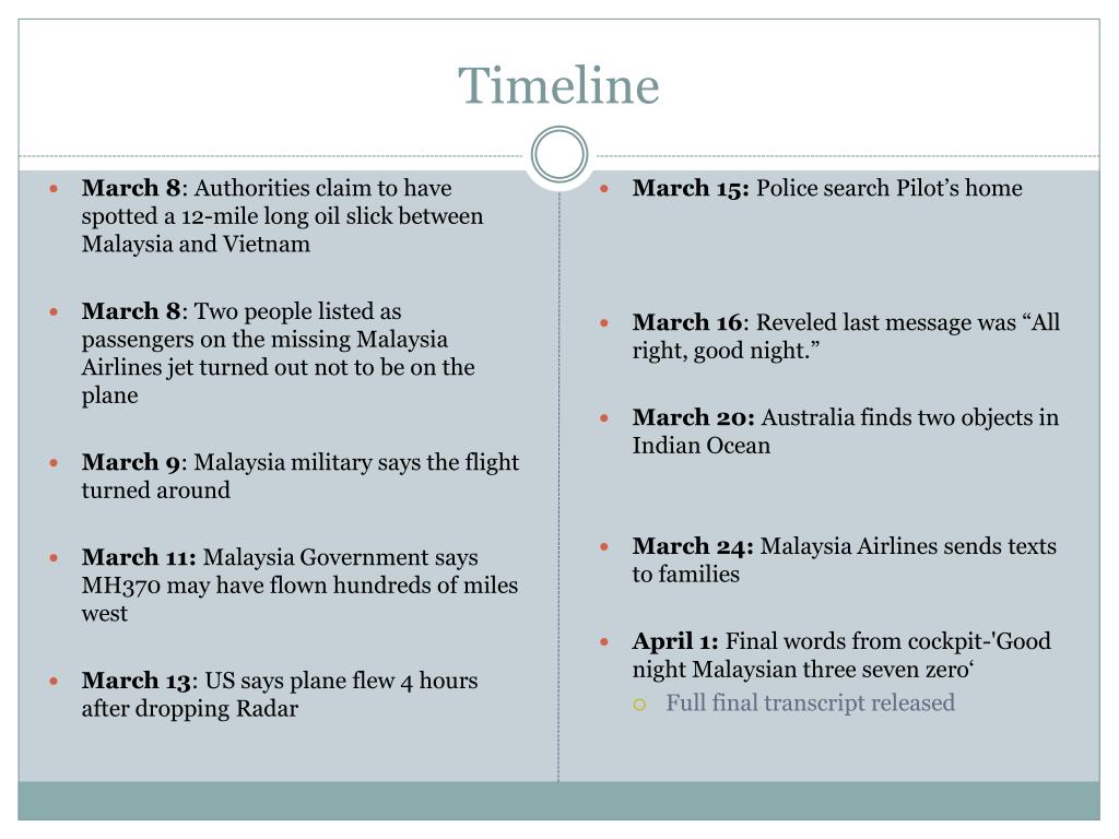 Timeline March 8: Authorities claim to have spotted a 12-mile long oil slick between Malaysia and Vietnam March 8: Two people listed as passengers on the missing Malaysia Airlines jet turned out not to be on the plane March 9: Malaysia military says the flight turned around March 11: Malaysia Government says MH370 may have flown hundreds of miles west March 13: US says plane flew 4 hours after dropping Radar • March 15: Police search Pilot’s home • March 16: Reveled last message was “All right, good night.” • March 20: Australia finds two objects in Indian Ocean • March 24: Malaysia Airlines sends texts to families • April 1: Final words from cockpit-'Good night Malaysian three seven zero‘ • Full final transcript released