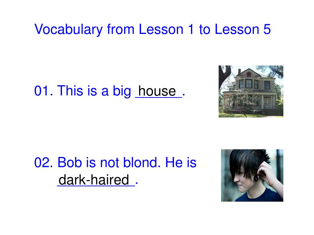 Vocabulary from Lesson 1 to Lesson 5 01. This is a big ______. house 02. Bob is not blond. He is __________. dark-haired