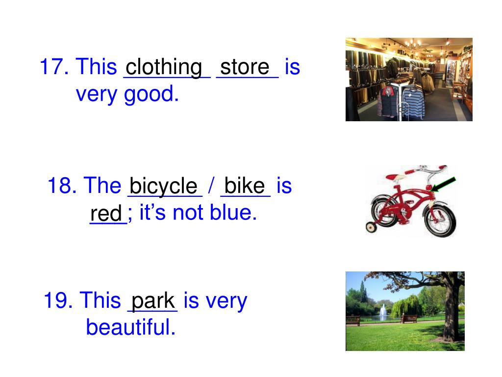store 17. This _______ _____ is very good. clothing 18. The ______ / ____ is ___; it’s not blue. bike bicycle red 19. This ____ is very beautiful. park