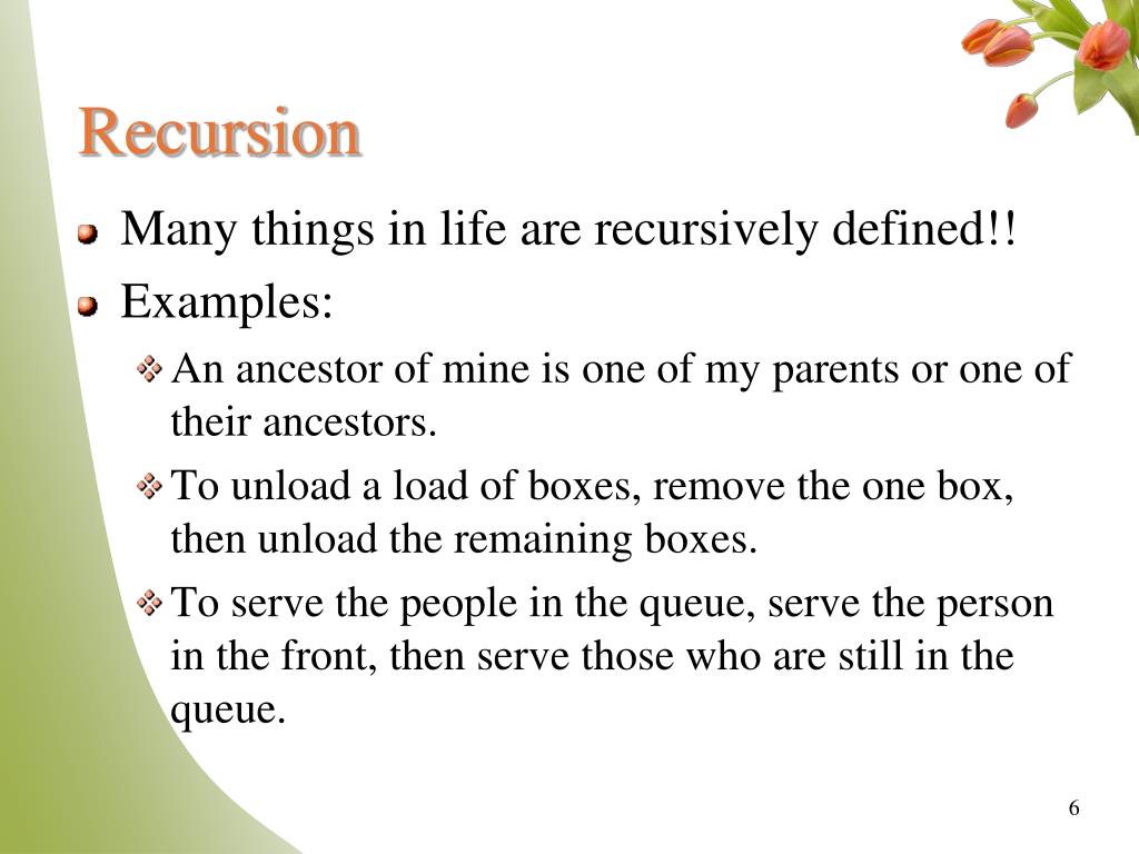 Recursion • Many things in life are recursively defined!! • Examples: • An ancestor of mine is one of my parents or one of their ancestors. • To unload a load of boxes, remove the one box, then unload the remaining boxes. • To serve the people in the queue, serve the person in the front, then serve those who are still in the queue.