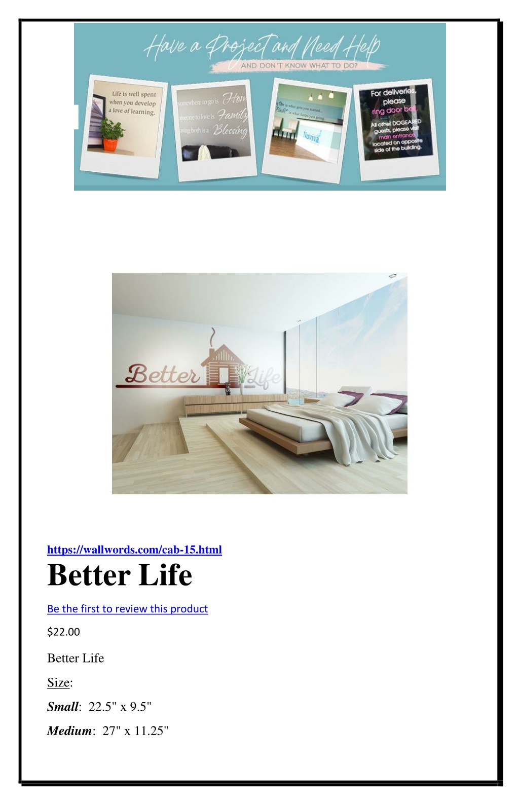 https://wallwords.com/cab-15.html Better Life Be the first to review this product $22.00 Better Life Size: Small: 22.5" x 9.5" Medium: 27" x 11.25"