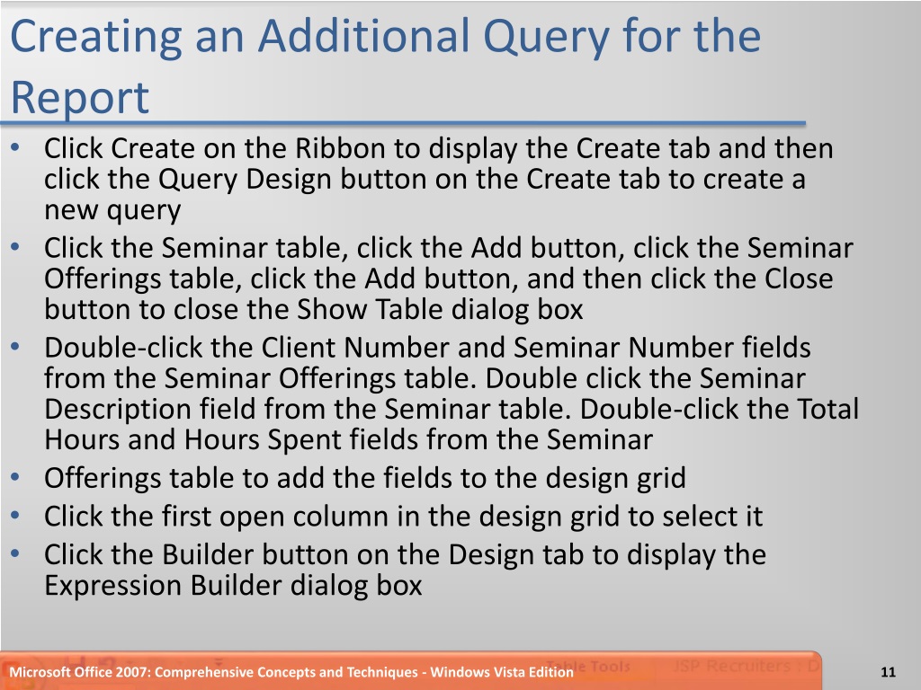 Creating an Additional Query for the Report • Click Create on the Ribbon to display the Create tab and then click the Query Design button on the Create tab to create a new query • Click the Seminar table, click the Add button, click the Seminar Offerings table, click the Add button, and then click the Close button to close the Show Table dialog box • Double-click the Client Number and Seminar Number fields from the Seminar Offerings table. Double click the Seminar Description field from the Seminar table. Double-click the Total Hours and Hours Spent fields from the Seminar • Offerings table to add the fields to the design grid • Click the first open column in the design grid to select it • Click the Builder button on the Design tab to display the Expression Builder dialog box Microsoft Office 2007: Comprehensive Concepts and Techniques - Windows Vista Edition