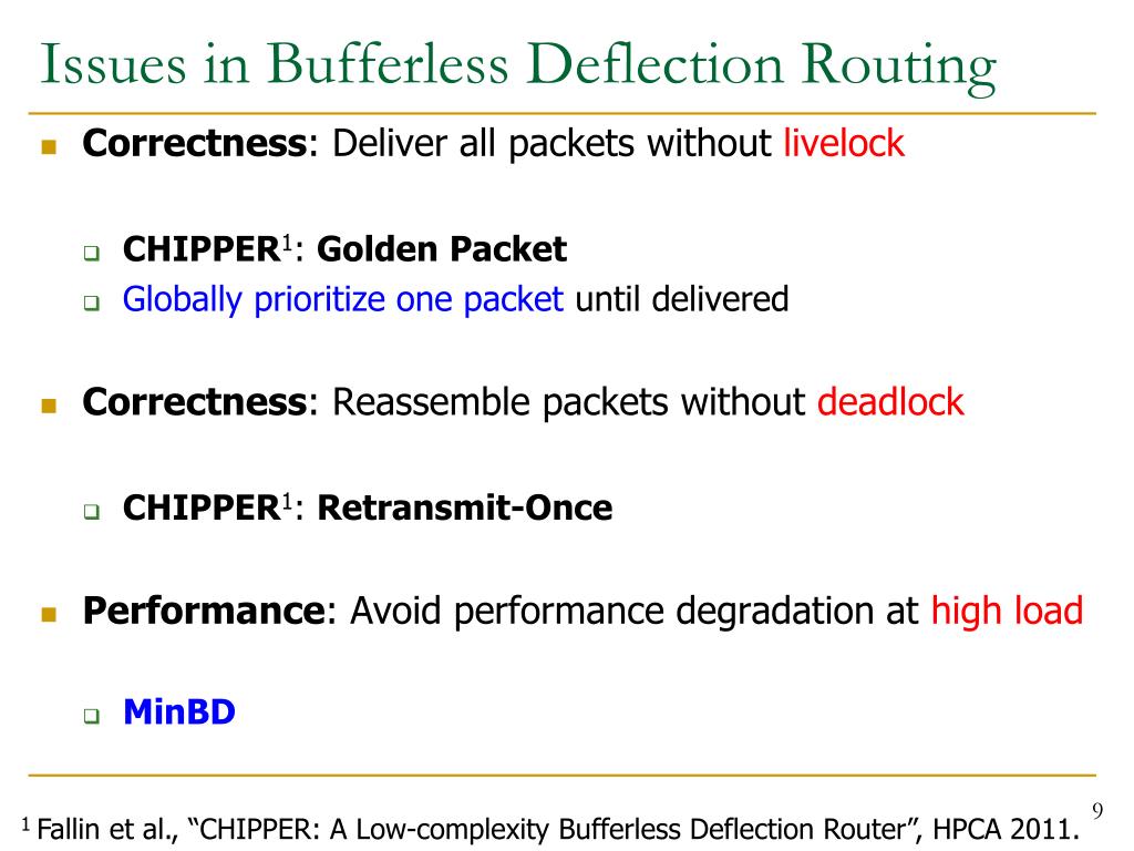 Issues in Bufferless Deflection Routing • Correctness: Deliver all packets without livelock • CHIPPER1: Golden Packet • Globally prioritize one packet until delivered • Correctness: Reassemble packets without deadlock • CHIPPER1: Retransmit-Once • Performance: Avoid performance degradation at high load • MinBD 1 Fallin et al., “CHIPPER: A Low-complexity Bufferless Deflection Router”, HPCA 2011.