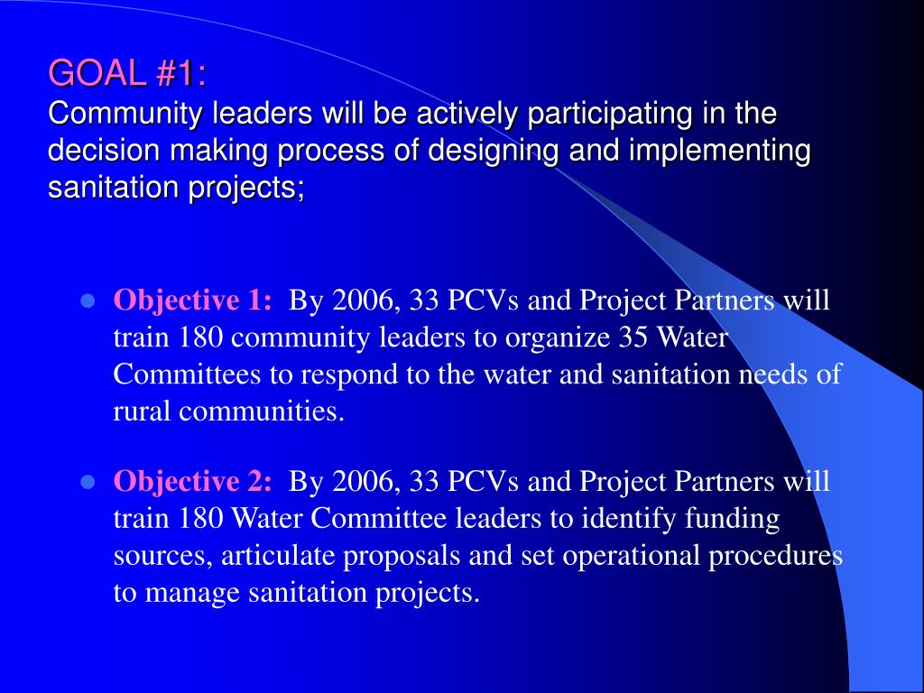 GOAL #1:Community leaders will be actively participating in the decision making process of designing and implementing sanitation projects; • Objective 1:By 2006, 33 PCVs and Project Partners will train 180 community leaders to organize 35 Water Committees to respond to the water and sanitation needs of rural communities. • Objective 2:By 2006, 33 PCVs and Project Partners will train 180 Water Committee leaders to identify funding sources, articulate proposals and set operational procedures to manage sanitation projects.